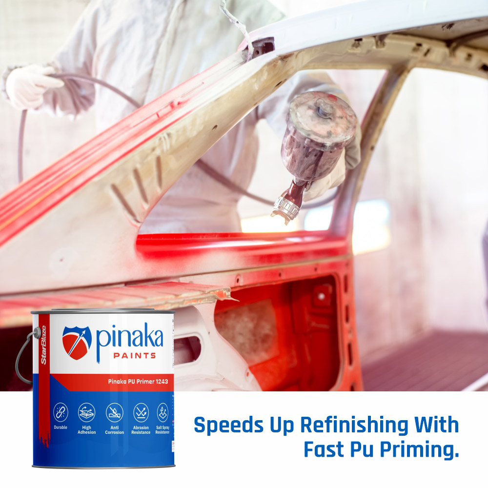Pinaka PU Primer 1243 is a two-component, fast-drying polyurethane primer engineered for vehicle refinishing and industrial metal preparation. It forms a smooth, high-adhesion base layer that enhances topcoat bonding and ensures superior film appearance for PU clear and pigmented systems. With faster drying than synthetic primers and excellent flow, this primer supports high-productivity finishing environments where turnaround time is critical. Its 4:1 mixing ratio, strong adhesion, and uniform film formation make it ideal for professional refinishing and metal coatings.